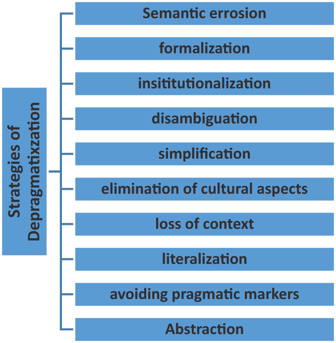 These are represented by semantic erosion, formalization, institutionalization, disambiguation, simplification, elimination of the cultural aspects, loss of context, literalization, avoiding pragmatic markers, and abstractions. These strategies will lead to the de-pragmatized utterances where they are conventionalized and then they are represented as new utterances, new expressions, new context, and new contextual factors adding up to the language and finally enriching the language of any given language according to any given culture and given context and given a new context.